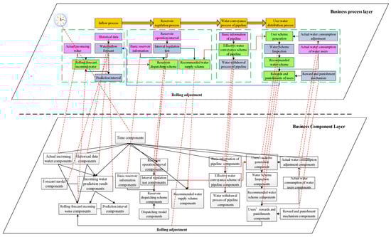 The realization of the mutual feeding business between the multi-time scales operation scheme and the implementation operation scheme is shown in Figure 8. On the interface, we can see that the interface is composed of two parts: the water consumption plan and the operation scheme. On the business process layer, we can see that there are two-way arrows between the planned water consumption and the operation scheme, and there are nesting and mutual feeding relationships between them. In Figure 8, all arrows refer to the inflow and outflow of data flow, the red arrow refers to the outflow of results from the normal process of forecasting operation, and the blue arrow refers to the data flow for feedback adjustment operation.