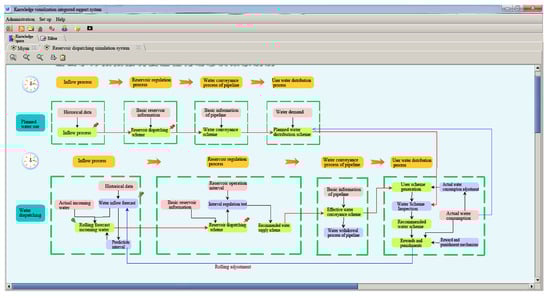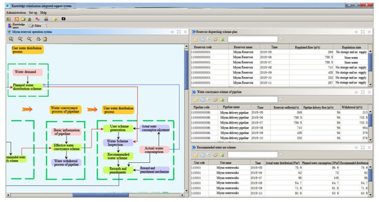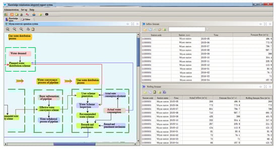 The operation scheme is based on the operation method library and operation target library established in advance. The operation method component and operation target component are customized on the corresponding nodes in the knowledge graph drawn on the platform. Combined with the actual operation requirements, the operation target and operation method are selected in the corresponding components to calculate the operation scheme. Reservoir regulation calculation is carried out according to its characteristic water level and storage capacity, as well as water level discharge curve and water level storage capacity curve. The pipeline calculates the water delivery capacity of the pipeline and generates the pipeline water delivery plan according to the water discharge process of the reservoir and the attributes of the pipeline itself. The user generates the user’s planned water distribution scheme according to the user’s water demand and the pipeline’s water delivery scheme. The operation scheme and the user’s planned water distribution scheme are shown in Figure 10. In the figure, a comparison was made between the user planned water allocation and the recommended water consumption after rolling forecast adjustment. It can be seen that the recommended water consumption after rolling adjustment is closer to the actual water use, thus reflecting the applicability of this mechanism.