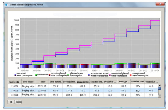 In the process of reservoir operation, it is necessary to conduct interval regulation inspection on the reservoir operation plan. If the discharge flow is unreasonable, the operation regulation can be reselected or the operation range can be recalibrated. If the result is reasonable, the recommended operation scheme can be generated. Figure 11 shows the recommended water use scheme generated. The actual water use plan can be verified by the user planned water distribution plan generated above, and the excess water amount is expressed by a red bar graph. After the inspection, a recommended water use plan can be generated. Finally, according to the designated step-by-step over-plan water price as a reward and punishment mechanism, users will be punished for exceeding the planned water volume. For users with penalties, they can adjust their next water use plan, and they need to adjust the incoming water on a rolling basis to achieve dynamic rolling control of the entire water volume allocation process.