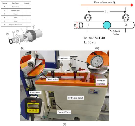 Bench proposal to measure the K coefficient in the check valve. (a) Check valve components. (b) valve positioning concerning pressure gauge reading. (c) Experimental setup.