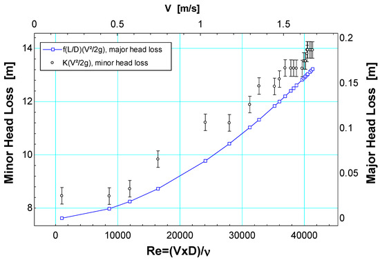 Table 1 presents the measurements of flow velocity, pressure drop, and the numerical estimates with Equations (1), (5) and (7) of the local loss in the fitting and coefficient of loss of the check valve. The flow velocities were selected to obtain the hydraulic characterization of the check valve according to the self-cleaning criteria that residential drinking water pipes in Colombia should have as a design condition [10]. Figure 3 presents a comparison between the major and minor losses of the system, between the points where the pressure measurement was placed before and after the location of the check valve, and for different Reynolds numbers. For the Reynolds numbers evaluated in this work where the temperature was 25 °C and the inside diameter of the pipe was 20.9 mm, the frictional energy loss obtained by Darcy’s formula for the pipe length L is small compared to the minor losses caused by the check valve. The frictional loss estimation for Figure 3 was calculated using Equations (3), (5), (6), (9) and (10). According to Table 1, it can be considered that the effects of frictional loss for a straight section are negligible in the assembly of this hydraulic bench, including the length of the hose of the experimental setup. This could be justified because both the length and the absolute roughness possess values that contribute to making this factor minimal, and therefore it is expected that the contribution of the major head losses is negligible. Consequently, when comparing the major and minor head loss values in Figure 3, the significant effect of the pressure drop in the water stream would be in the passage of this fluid through the interior of the check valve. The supplementary materials of this research are given in the link given at the end of this manuscript. It contains images of the experimental setup, dataset and the technical information about the instruments used to collect the data.