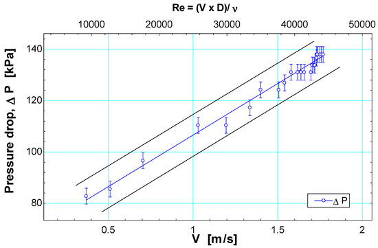 Figure 4 is an adjusted linear model that represents the correlation between the flow velocity and the pressure drop of the check valve, represented by the black line in Figure 4, and considers the range of recommended flow values for the design of conduction pipes for domestic pipes in Colombia. The blue lines are the lower and upper prediction limits for new observations. These extreme limits describe how much it would be possible to predict where a new observation might be positioned for the correlation between velocity and pressure drop. Regardless of sample size, new observations could vary around the black line based on the estimated standard deviation. The pressure drop in the valve is directly proportional to the flow velocity that circulates through the device and tends to produce pressure drops with less dispersion for velocity values between 1.4 m/s and 1.8 m/s. This could be because, for these velocity values, the fluid would be completely developed. In this sense, the pressure drop and the flow velocity are directly proportional with an adjusted correlation coefficient of 98.13 [29].