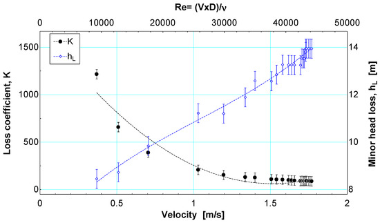 Figure 6 presents a relationship between the coefficient of loss of the check valve and the local loss of the accessory concerning the Reynolds number, which was estimated to have an inside diameter of 20.9 mm and a water temperature of 25 °C. As the flow rate increases, the loss coefficient decreases inside the device. This trend is similar to the one presented by the check valve concerning the flow velocity of Figure 5, which could be related because the Reynolds number and the velocity of flow in the pipe are directly proportional. On the other hand, the energy loss of the device increases as the Reynolds number is greater. The inverse behaviors between the loss coefficient and the minor loss concerning the Reynolds number could be due to the condition of fully developed flow in the valve for values of flow velocities between 1.4 m/s and 1.8 m/s according to Figure 4 and Figure 5, respectively. Therefore, according to the point of convergence between these variables, it is believed that a Reynolds number close to 20,000 could minimize both the effect of the energy loss of this check valve and the loss coefficient, K [21].