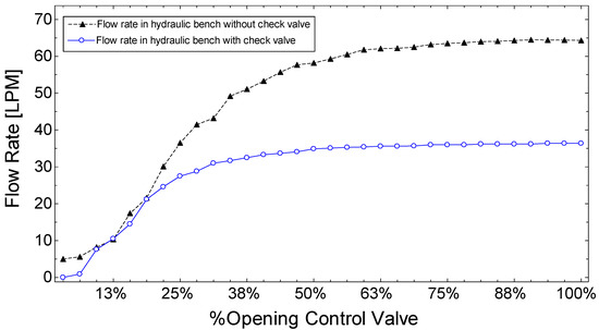Figure 7 shows the behavior of the flow that circulates through the hydraulic bench under study when the recirculation flow was measured with and without a check valve under the stipulated working relative pressures below 147 kPa. The bank control valve was gradually opened while the operating flow was recorded with the flowmeter. It is observed that for opening percentages lower than 25%, the hydraulic bench behaved in a very similar way with and without a check valve. The check valve set the recirculation flow for values above 30% to an approximate value of 36 LPM. This could be due to the fully developed flow condition when maximum deformation is achieved in the internal spring of the check valve.