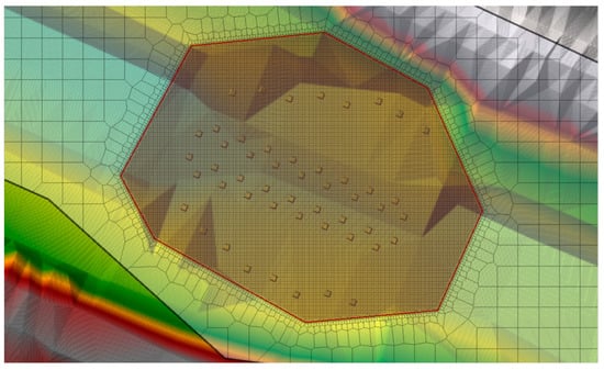 Figure 5), while keeping the Courant criterion. The limit for the Courant´s number (Equations (7)–(9)) affects both the cell size of the computational mesh as well as the selected computational equation (SWE-ELM (Shallow Water Equations, Eulerian–Lagrangian Method), SWE-EM (Shallow Water Equations, Eulerian Method), or DWE (Diffusion Wave Equations)) [