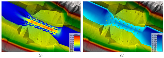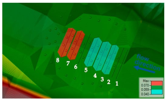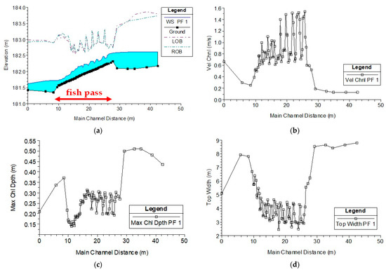 Figure 6d). From the point of view of prescribed limits in the fish pass, the velocities are below the limit (1.2 m∙s