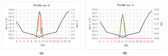 Table 4). Compared to the measured velocity values, the 2D model exceeded the velocities, while the 1D model did not achieve them. Simulated depths from both models are in fairly good compliance when half of the monitored profiles also match the measured depths.