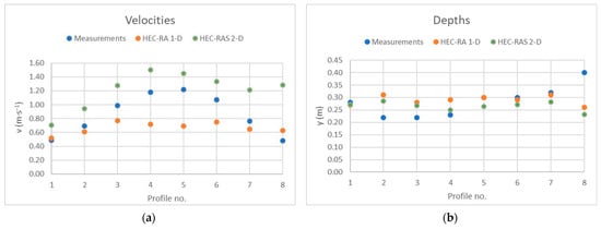 Regarding the achieved depths (range for the 1D model 0.14–0-37 m and the 2D model 0.20–0.28 m, respectively), the results are very similar for both of the models and are very close to the measured values. For a visualization of results (velocities and depths) compared to the measured data, the following graphs (