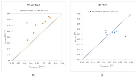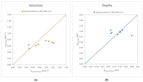 Regarding the velocity (m∙s−1) assessment of the 1D model, the RMSE was 0.293 and the MAE was 0.185. Similar to the depth assessment, a smaller RMSE and MAE indicate better accuracy. These values suggest that the 1D model performed reasonably well in predicting velocity, but with slightly higher errors compared to the depth assessment.