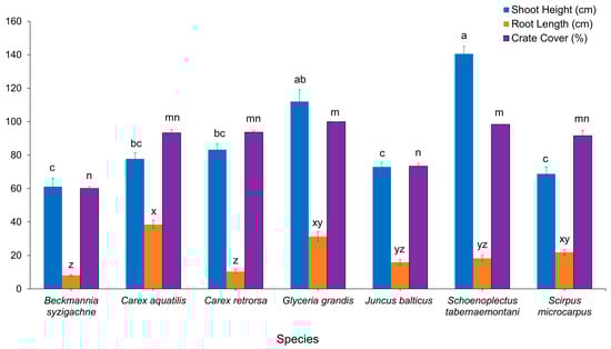 Macrophyte growth at the end of growing season (20 weeks) in constructed floating wetland. Columns that do not share a common letter are significantly different at p ≤ 0.05.