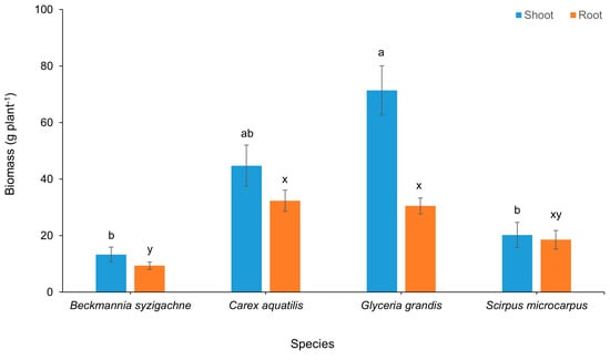 Macrophyte shoot and root biomass at the end of growing season (20 weeks) in constructed floating wetland. Columns that do not share a common letter are significantly different at p ≤ 0.05.