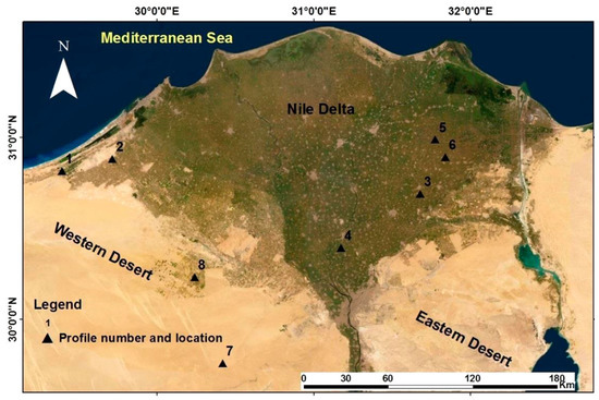 Eight soil profiles were selected from four soil catchments of different parent materials in Egypt. These regions are situated in eastern, western, southern, and middle Egypt: Profile 1 (P1)—elevation 31 m a.s.l., 30°48′56.008″ N and 29°23′38.764 E; Profile 2 (P2)—elevation 26 m, 30°53′5.766″ N and 29°43′2.444″ E; Profile 3 (P3)—6 m, 30°41′20.103″ N and 31°40′50.089″ E; Profile 4 (P4)—14 m, 30°23′24.156″ N and 31°10′1.891″ E; Profile 5 (P5)—13 m, 30°58′58.057″ N and 31°46′32.347″ E; Profile 6 (P6)—2 m, 30°53′5.766″ N and 31°49′57.703″ E; Profile 7 (P7)—224 m, 29°45′23.546″ N and 30°24′58.047″ E; Profile 8 (P8)—56 m, 30°14′2.767″ N and 30°14′7.755″ E (Figure 1).