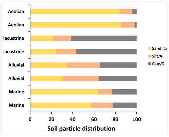 The surveyed soils were divided into four types: fluvio-marine, Nile alluvial, lacustrine, and aeolian deposits, based on soil classification, morphological description, and mineralogical, physical, and chemical properties. Diagnostic horizons descriptions and morphological aspects were identified using the criteria of [29] (Table 1). The soils of P1 and P2 were derived from marine deposits (limestone) with varying CaCO3 levels, where the Bca horizon developed as a result of CaCO3 accumulation in the subsurface layer [38]. P3 and P4 were derived from the alluvium deposits, where the argillic B horizon developed. Salic and Natric B horizons developed in the soils of lacustrine deposits in profiles 5 and 6. Soils that originated from aeolian deposits (P7 and P8) were weakly developed and have no pedogenetic horizons. The solum thickness of the studied soil profiles varied from 60 cm in the soils originating from aeolian deposits to 2.0 m in alluvium soils. In dry conditions, the soil color ranged between very pale brown (10YR 7/3), dark grey (10YR 4/1), very dark greyish brown (10YR 5/2), and yellow (10YR 7/6) for marine, alluvium, lacustrine, and aolian deposits, respectively. Clay content was the highest in alluvium- and lacustrine-originated soils, while the sand content was the highest in marine- and aeolian-derived soils (Figure 2). The uppermost surface of the marine deposit’s soils had a massive structure that was subangular and blocky downward. The structure was granular in the topsoil horizons of alluvial deposits, while it was subangular in the topsoil of lacustrine deposits and changed to massive profiles downward. The aeolian deposits were characterized by a weak structure along the profiles. In the coarse and fine textured horizons, respectively, the soil consistency ranged from non-sticky to moderately sticky and from non-plastic to moderately plastic (Table 1).