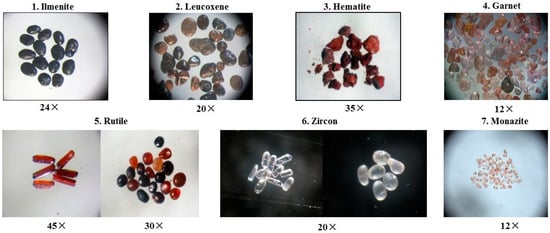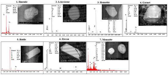 The original samples, which were derived from different deposits, were dried. Using bromoform, they were all set for mineral separation (Sp. Gr. 2.86 g cm−3). Individual grains of heavy minerals were subjected to chemical analyses using a Phillips XL-30 environmental scanning electron microscope (ESEM), while semi-quantitative EDX was used for the mineralogical analysis of the mineral components [37].