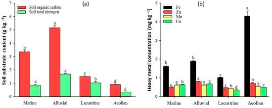 Effect of different parent material deposits (fluvio-marine, Nile alluvial, lacustrine, and aeolian) on (a) soil organic carbon (SOC) and soil total N content and (b) soil heavy metal (Fe, Zn, Mn, and Cu) content using variance analysis. Values are presented as means ± standard deviation (SD) using the number of the studied soil profiles (n = 8). For each attribute, bars with different superscript letters (a, b, c, and d) denote a significant difference between the effects of types of parent material at p < 0.05. The appearance of the same letter means that the difference was not significant.