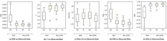This section assesses the performance of models trained using the transfer learning technique described in Section 2.5. Figure 5 illustrates the statistical metrics for test performance of the MLP and Res-LSTM models. The MLP and Res-LSTM models were selected for comparison because MLP serves as the baseline model, and the Res-LSTM’s performance is generally in line with that of the four other models trained. Within each boxplot, the OT box represents the model trained on observed data and the TL box represents the transfer learned model.