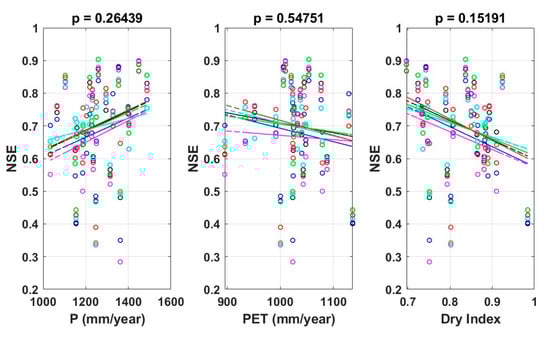 Figure 10 is the result of examining the relationship between the PUB performance of the six models by scheme MG and the meteorological and topographical characteristics of the watershed. No significant difference was found in model performance in response to changes in annual precipitation, annual potential evapotranspiration, or dry index. In addition, topographical characteristics such as area, curve number, saturated hydraulic conductivity, and impervious rate did not have a significant effect on the model’s performance. This means that distortion due to meteorological and watershed characteristics did not occur in the performance results of the constructed models.