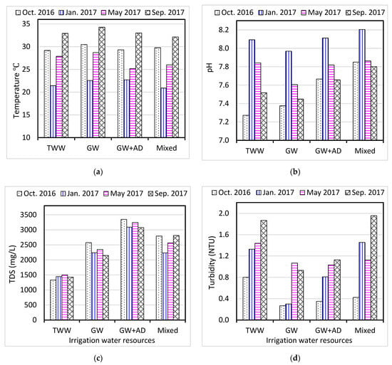 Average concentrations of (a) temperature, (b) pH, (c) TDS (mg/L), and (d) turbidity (NTU) in irrigation water resources collected from Al-Ahsa Oasis, Saudi Arabia. TWW stands for treated wastewater, GW for groundwater, GW + AD for groundwater combined with agriculture drainage, and mixed for TWW + GW + AD (the same for Figure 3, Figure 4 and Figure 5).