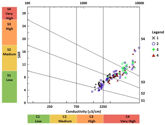 Classification of the collected irrigation water samples (n = 148) based on the USSL diagram regarding both salinity hazards (C1–C4) and sodium hazards (S1–S4) [42].