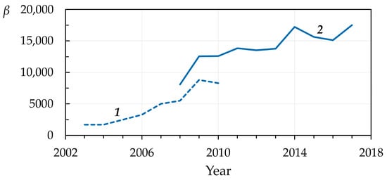 Change in the number (β) of reintroduced beavers (Castor fiber L.) in the Republic of Tatarstan (67,847 km2) from 2003 to 2017. 1—according to the Federal Research Center for Development of Game Management. Available online (in Russian): http://www.ohotcontrol.ru (accessed on 22 May 2023); 2—according to the State Committee of the Republic of Tatarstan for biological resources. Available online (in Russian): https://ojm.tatarstan.ru (accessed on 22 May 2023). Note: It is noteworthy that in 1949, according to the first electronic source, there were only 52 beavers in the republic.