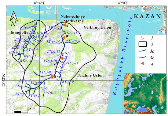 Geodetic work was carried out in August and September 2022 in the valleys of the Morkváshinka and Morkváshka rivers (right tributaries of the Volga River (Figure 2), Verkhneuslonsky municipal district of the Republic of Tatarstan, European Russia)), which differ in the length and degree of anthropogenic transformation of the natural landscapes of their basins. The choice of these rivers was due to the fact that their valleys are geomorphologically typical of the northern extremity of the Volga Upland [33]. The total length of the Morkváshinka River, according to GNSS survey data, is 16.2 km (the total length, combined with one of the dry valleys in the upper reaches of the river, is 16.6 km); the length of the Morkváshka River is 7.4 km (7.8 km). The construction of man-made ponds in the middle reaches of these rivers and water intake for private households led to a significant decrease in water flow, especially during the summer and autumn low water period. High evaporation from the surface of beaver ponds also plays an important role in reducing runoff. This resulted in the appearance of sectors of the channel drained during the low water season (in the lower reaches of the Morkváshinka River) (Figure 3B). The appearance of runoff in certain sectors of the channels of this river during the summer-autumn low water period is mainly associated with the small lateral tributaries that unload groundwater during this time.