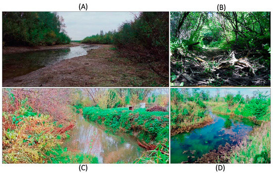 Views of the Morkváshinka River (their locations are shown in Figure 2). (A)—the lower (near-estuary) reaches of the river, (B)—seasonally drained riverbed, upstream of Naberezhnye Morkvashi, (C)—the river near Lesnye Morkvashi, (D)—dammed part of the river, upstream of anthropogenic ponds (the photos were taken by the authors in August and October of 2022).