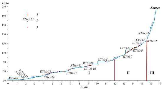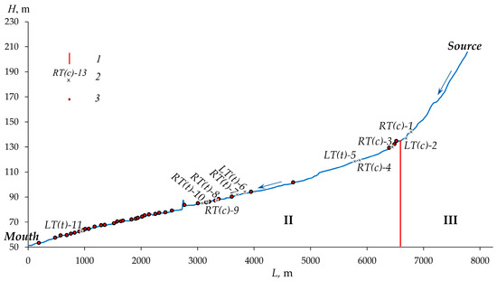 The longitudinal profile of the Morkváshinka River. 1—the boundaries of the river channel sections: I is with the average gradient of <1%; II is with 1–3%, III is with >3%; 2–tributaries (RT—right tributary, LT—left tributary (c is a permanent stream, t is a temporary stream); 13, 14, 15… are ordinal numbers of the tributaries, the position of which is indicated in Figure 2), 3—beaver dams.