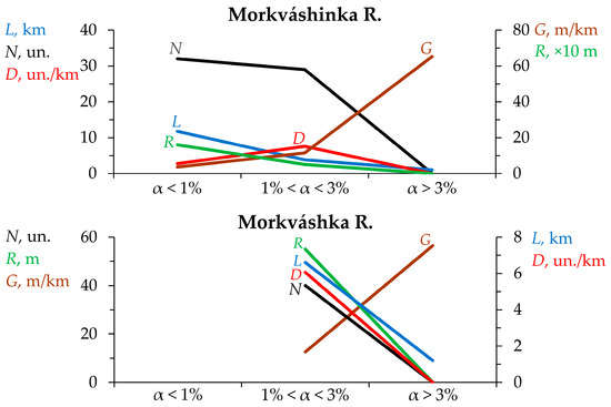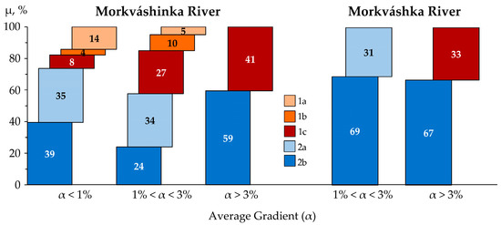 There is no section in the Morkváshka River channel with relatively small average gradients; sections with medium and large average gradients occupy 85% and 15% of the entire length of this river, respectively (Figure 5). This distribution of the channel gradients reflects well the general concave profile of similar small rivers in the study region.