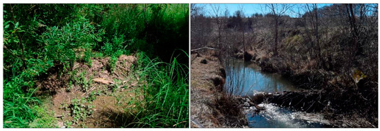 As mentioned above and in many other studies, the results of beaver activity are reflected primarily in the hydrological regime of rivers through changes in the elements of the water balance. However, the geomorphological role of this rodent is also important. This role consists, for example, of the creation of riverbank burrows and canals and intensive sedimentation in a dammed channel and on the floodplain of small rivers. Beavers often construct several burrows within the same pond [51]. For example, along two seasonally drained ponds with a total length of about 200 m in the Morkváshinka River, we found several dozen such burrows of different internal volumes. When such burrows are created, a significant amount of sediment enters the riverbed [52,53]. In addition, riverbank burrows can collapse during snowmelt-induced or rainfall-induced floods, as well as under the influence of other external factors [54], thereby transforming the relief of both the channel and the floodplain. The creation of relatively high and long dams by beavers, which also occupy a low floodplain, sometimes leads to the appearance of multi-branch channels on them [51]. Such sites are distinguished on the studied rivers, for example, in the upper part of the middle course of the Morkváshinka River and in the middle course of the Morkváshka River. Sometimes beavers build dams in places where anthropogenic dams break or in the bottoms of drained anthropogenic ponds (see the right-side photo of Figure 8), creating a complex topography and forming a complex sequence of accumulation of anthropogenic and castorogenic (beaver-induced) sediments. We also encountered such phenomena in the bottoms of the studied river valleys. Large amounts of mineral and organic material are deposited in beaver ponds [5,10,40,55]. Butler and Malanson [56,57] estimated sediment accumulation rates from 2 to 39 cm yr−1 in some ponds in Montana. In Oregon, in the early years of the ponds of this state, the sedimentation rate was up to 47 cm yr−1, but after six years it decreased to 0.075 cm yr−1 [58]. In Germany, the average sedimentation rate was 6 cm yr−1 [59]. According to Butler and Malanson [5], the rate of sedimentation can vary by a factor of 10, even within the same river basin, and depend on the geological and geomorphological features of a particular area. The above and numerous other facts show the importance of studying beaver activity as an environment-forming, environment-transforming, ecological, and even societal factor in river valleys, primarily in the valleys of small rivers as one of the most environmentally vulnerable elements of the river network.