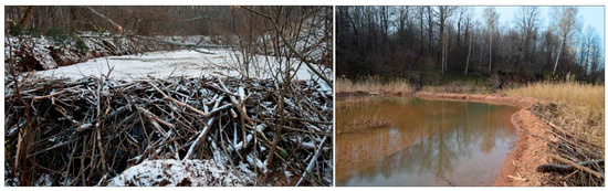 An important feature of small rivers is the close relationship between runoff formation and the landscapes of their basins [1,2,3]. Therefore, all natural and anthropogenic processes occurring in the channels and catchment areas of small rivers are reflected primarily in their runoff of water, sediment, and dissolved substances. In recent decades, the small rivers of Eastern Europe have been significantly affected by the beaver (predominantly the Eurasian beaver (Castor fiber L.)), and these affects manifest themself in the construction of dams and related ponds. This results in a decrease in the velocity of flow, a decrease in water runoff, and the accumulation of sediment and related pollutants along the channels and floodplains of these rivers, as well as the transformation of their floodplain landscapes [4,5,6,7,8,9,10,11,12]. It is important to note that this often occurs in conjunction with the negative anthropogenic impact on small watercourses.