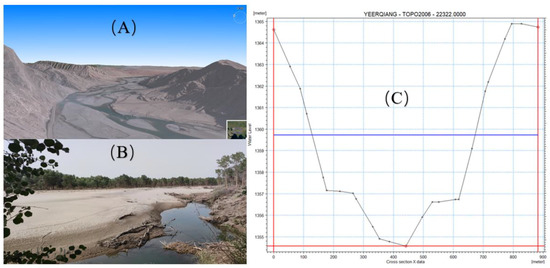 Geomorphological features of Yarkant River. (A) Morphological characteristics of the river at a distance of 22 km from the starting mile of the study area. (B) Photographs of river cross-sections in Bachu County. (C) Typical river cross section files in MIKE 11.