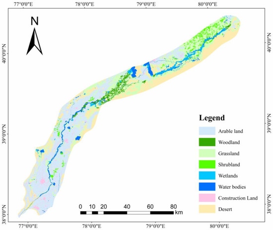 The projection coordinate system in this study was defined as CGCS2000_GK _CM _75E. The study area extent map, digital elevation model DEM, land use type map, initial water level map, and river network distribution map required for the model were all projected onto this coordinate system. The land use data in the study area included eight primary types: cropland, woodland, grassland, shrubland, wetland, water bodies, building land, and bare land, as shown in Figure 3. The area occupied by the eight land use types was 1.5 × 104 km2, with 39.2% cropland, 23.5% grassland, and 22% bare land. The values applied to the MIKE SHE model by land use are shown in Table 2. The leaf area index (LAI) and root depth were determined by both land use type and vegetation cover type; the range of values for the leaf area index was 0–6, while the range of values for the root depth was 0–1000 mm.