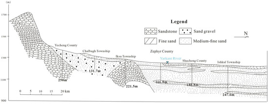 Based on both the borehole data and previous studies [14,22], an A–A’ profile and regional hydrogeological map of the plain area of the Yarkant River basin were drawn, as shown in Figure 5 and Figure 6. The single unconfined aquifer was located in the middle and front of the alluvial sloping plain in front of the mountain. The lithology of the aquifer was pebble and gravel, and sand and gravel, while the groundwater level was more than 15 m below the surface elevation, with the thickness of the aquifer being greater at roughly 150 m. In the central part of the alluvial fan near the front edge, there was a weakly permeable layer of fine sand and sub-clay on the aquifer, the thickness of which was thin near the mountains and gradually thickened in the distant mountains.