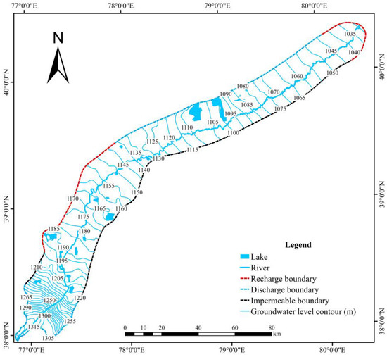 Generalizing boundary conditions is a key step in building conceptual hydrogeological models. The boundaries can be divided into fixed head boundaries, fixed flow, and mixed boundaries based on the circumstances of water exchange and various hydrogeological conditions. Fixed flow boundaries can be divided into the recharge boundary, the discharge boundary according to the direction of the lateral recharge of the boundary, and the zero-flow boundary where the lateral recharge is zero. The lakes in the study area had a certain hydraulic connection with the groundwater and were chosen as fixed head boundaries. The southwestern parts of the boundary were perpendicular to each other in the direction of the groundwater flow, and the groundwater flowed into the study area; the northern part of the boundary received a recharge from groundwater runoff of the Kashgar River basin, so the recharge boundary was chosen. The groundwater flows out of the study area from both the western part of the boundary and the northeastern part of the boundary, and thus the discharge boundary was selected.