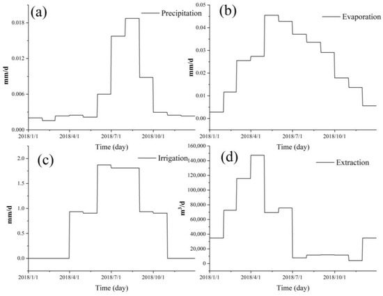 Time series data for 2018 in Shache County: (a) Precipitation, (b) Evaporation, (d) Extraction. (c) Amount of irrigation in the study area.