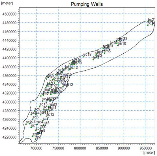 The pumping well module in the model is used to generalize the extracted groundwater. According to the borehole survey, the number of boreholes in the study area was 19,052 in 2018. The annual volume of groundwater extraction was about 1940 million m3, with the groundwater extraction mainly being used for agricultural irrigation, while the amount of domestic and industrial water borehole extraction accounted for only 3% of the total extraction. Due to the large number of boreholes, they were generalized to 40, distributed in the study area according to the actual groundwater extraction proportion in each county and city, and were then extracted according to the existing irrigation period. The location of the pumping well is shown in Figure 10. The projection coordinate system of the pumping well was CGCS2000_GK _CM _75E. As the river flows are mainly concentrated in July, August, and September, for the spring irrigation, the amount of surface water was low and the irrigation water was mainly extracted from the groundwater.