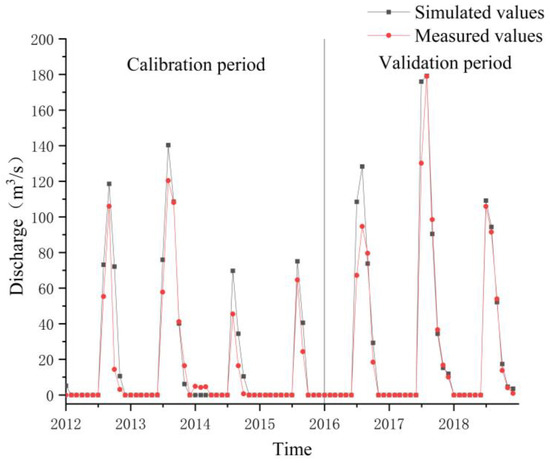 Based on the control cross-sections in the lower and middle reaches of the Yarkant River basin, the model was rate-calibrated and validated at the Hainiaz hydrological station for the series of the monthly flows from 2012 to 2018, and the results are shown in Table 4. As seen there, after calibration, the model can more accurately simulate the runoff in the Yarkant River, with similar variation trends. The low water balance coefficient in the calibration period was due to the low total runoff in 2014 and 2015, which were dry years. Comparing the simulation results of the calibration and validation periods, the results for the validation period were higher than those of the calibration period.