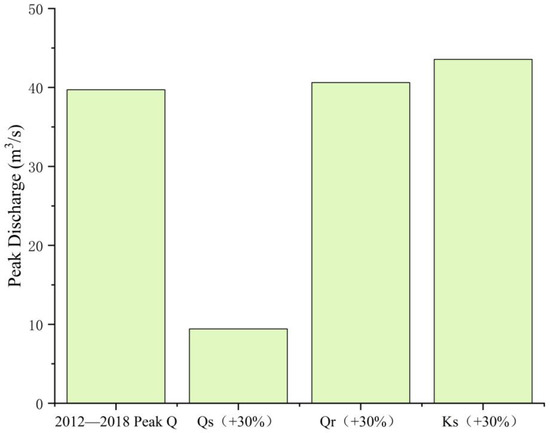When the saturated hydraulic conductivity increased by 30%, the minimum peak flow rate was 34.87 m3/s, a reduction of 12.2% compared to the standard value. When the saturated hydraulic conductivity was reduced by 30%, the maximum peak flow rate was 47.26 m3/s, an increase of 18.7% compared to the standard value.