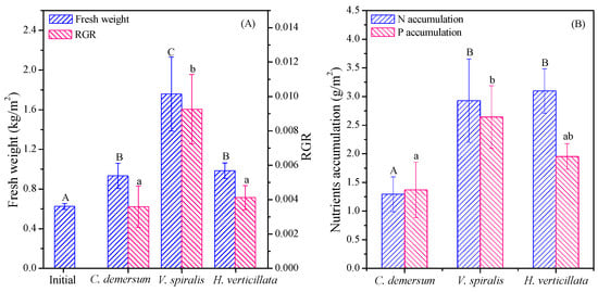 Growth parameters of the three submerged macrophytes ((A) Fresh weight and RGR of the submerged macrophytes; (B) N and P accumulation of the submereged macrophytes). Significant difference (p < 0.05) between treatments indicated by different letters (A, B, C, a, b) on the bars.