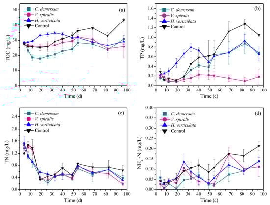 The decrease of TOC concentration in the overlying water of C. demersum treatment was obvious in the early 50 days of the experiment (Figure 3a). C. demersum has no root and floated in the top layer of water, the photosynthesis of which may be obviously higher than the other two species in this period because of the stronger light illumination, but this advantage disappeared when the leaves of V. spiralis and H. verticillata grew to flourish (50 days later). The mean concentrations of TOC in the overlying water of the three planted treatments were 26.6%, 24.3% and 22.1% lower than that of the Control 50 days later, respectively. The submerged macrophytes changed the redox environment of the water by increasing dissolved oxygen (DO) concentration, while the removal rates of organic matter in water depend on the DO levels available to the bacteria [23]. This can explain the lower TOC concentrations in the three planted treatments.