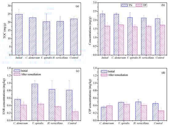 TN and TP concentrations in the sediment of the four treatments changed little at the end of the experiment compared with the background values (Figure 4b). On the one hand, better remediation performance under a high background concentration of TN and TP in the sediment may need a longer time [14]. This may be the main reason. TN and TP concentrations in the sediment reached several g/kg DW in this study. On the other hand, the removal of N and P may be inhibited by the ENR and CIP in the sediment. Ohore et al. [18] showed that the N and P removal efficiencies were decreased 22% and 9.3% by antibiotics in the constructed wetlands. It concluded that the impact of antibiotics on microbes affected the N removal directly in constructed wetlands [18].