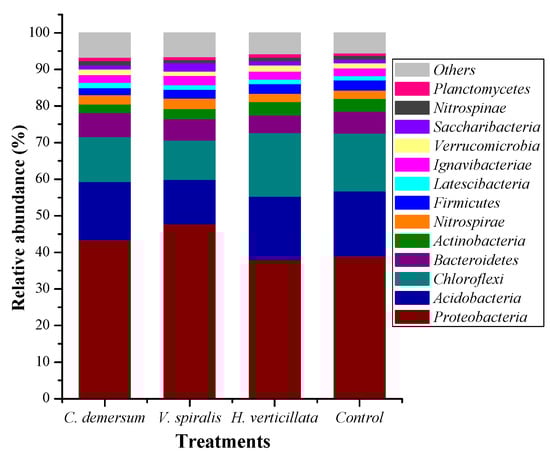 Table 1 showed the Alpha Diversity Index for the sediment samples from the four treatments. The values of Good’s coverage index were all higher than 0.984, suggesting that the depth of sequencing covered the majority of species in the samples. Table 1 shows that the number of OTUs in the sediment of the three planted treatments was more than that of the control, especially the sample of the V. spiralis treatment (p < 0.05). V. spiralis treatment contained more unique OTUs (144) than those in the other three treatments (59, 39 and 27, respectively). The Chao1 and ACE index of microbial communities in the sediment suggested that the richness and diversity of the microorganisms in the planted treatments were also significantly higher than those in the control, except for the H. verticillata treatment, in which the Chao1 and ACE indexes were comparable to the control (Table 1). Compared with the Control, V. spiralis induced an increase of 21.7% for the number of OUTs, 17.8% for Chao1 index and 19.3% for the ACE index of the microbial community in the sediment with ENR residues. There was also no significant difference, but higher numbers of OTUs and higher values of the Chao1 estimator, ACE and Shannon indexes were observed for bacterial communities in the H. verticillata microcosms compared to the C. demersum microcosms in a previous study [31]. The author explained that it was due to the direct influence of rooted H. verticillata on the sediment microbial community by oxygen release and organics secretion. This was consistent with our view that the roots promoted the microbial communities. We speculated that the inhibitory effect of ENR on microorganisms in the sediment may lead to the opposite results in this research. Therefore, the planting of submerged macrophytes, especially V. spiralis, increased the richness and diversity of the microbial communities in the sediment with ENR and CIP, which also played an important role in the construction of the unique microbial population [23]. The results of Man et al. [32] also showed that wetland plants formed the stability of rhizosphere microorganisms and increased their ability to tolerate antibiotics stress.
