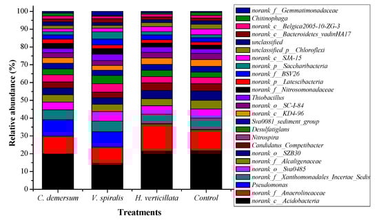Apart from bacterial community richness and diversity, the microbial community structure of the sediment in the four treatments was also analyzed at the phylum and genus level (Figure 5). The development of submerged vegetation significantly influenced the bacterial community structure in the sediment [33]. Proteobacteria, Acidobacteria and Chloflexi were the dominated phylotypes in the sediment of this study, accounting for 70.8–72.8% of the microbial community, which was similar with the results of Chao et al. [34]. The relative abundance of Proteobacteria in V. spiralis treatment (47.9%) was higher than that in the C. demersum treatment (43.5%), H. verticillata treatment (38.1%) and control (39.0%). Similar to this result, Ohore et al. [35] found that CIP caused an increase in the relative abundance of Proteobacteria in the epiphytic biofilm on V. spiralis, while the relative abundance of Acidobacteria and Chloflexi were lower in V. spiralis treatment compared with the other three treatments (Figure 5). Thus, V. spiralis promoted the growth of Proteobacteria and inhibited the growth of Acidobacteria and Chloflexi in the rhizosphere sediment with ENR.