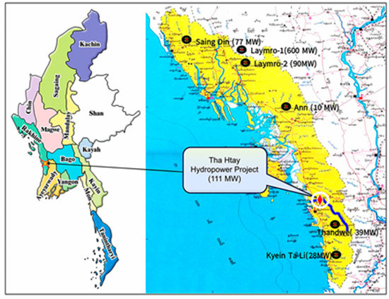 Hydropower ranked as the third-largest contributor to global electricity generation in 2020, following coal and natural gas, which contributed 17% of global generation output, and its total capacity itself increased by 70% globally over the last two decades [1]. Today, almost half of the world’s low-carbon electricity is currently generated by hydropower, making it an essential backbone of renewable energy. A 17% (230GW) increase in global cumulative hydropower capacity is also expected between 2020 and 2030, with capacity expanding from approximately 1330 GW to slightly above 1555 GW. Large-scale hydropower projects funded by the public sector have been the driving force behind the growth of hydropower on a global scale since the 1970s, particularly in emerging and developing economies [1]. Similarly, hydropower development has been a key feature of Myanmar’s energy policy for several decades to meet the country’s growing energy demand and reduce reliance on fossil fuels because the country has abundant water resources, particularly in its northern and eastern regions. So, the majority of electricity distribution is supplied to local areas of the country with the government’s capital budget and exported with foreign investment [2]. On harnessing water resources, the majority of Myanmar’s hydropower projects are state-owned projects [3] and dam-type hydropower schemes [4] with the purpose of electricity generation and agricultural irrigation, out of 27 operational hydropower stations with a total capacity of 3221 MW networked with the national grid [5], despite the fact that run-of-river (ROR) schemes, which are able to generate electricity by their reliance on diverting a portion of a river’s flow through turbines, are more interesting to mitigate environmental and social impacts. There are still over 50 additional hydropower projects (41,837.4 MW) planned for the future and eight hydropower projects (seven state-owned and one local developer) under construction in Myanmar, with 1691.6 MW of estimated installed capacity handled by the union government [5]. One of these projects is the ongoing construction of the Tha Htay Hydropower (THH) project (111 MW) situated in the Thandwe district of Rakhine state, which is the first-large hydropower project for the western region of Myanmar despite the identification of eight projects on seven rivers with hydropower development potential totaling 1155 MW in Rakhine [6].