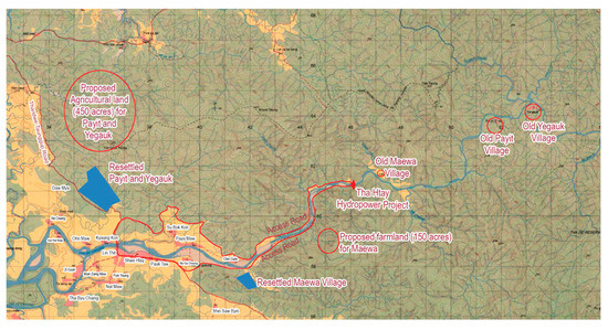The remaining two villages, Payit and Yegauk, needed to be resettled because they would be flooded in the event of river water diversion, pressing layers of soil together to form a dense structure for the dam. The project proponent initiated the resettlement of these two villages. It was near their submerged villages across the mountains, which were 16.1 km away inside toward the mountains from Thet Kay Pyin Village; the land use classification was vacant land for the resettlement. After agreeing on the resettlement site with the Villager from Payit and Yegauk, they worried that it would be less developed, lack health care services, and always depend on the road towards Thet Kay Pyin village to reach the Taungup–Thandwe road. In case the road was broken because of a natural disaster, their resettled village would be disconnected from Thet Kay Pyin and other regions. Then, it would be much farther from the Shwe Hlay Village tract than the condition of their previous villages. Therefore, they had another preferred location to be resettled, which is between Jin Chaung weir and Daw Mya Village, 19.31 km away from the dam of the THH project, and 32.2 km away from the longest distance of the submerged Yegauk Village tract. It would be beside the Taungup–Thandwe road and close to the Shwe Hlay Village tract, which would provide easier access to Thandwe township in cases of emergency health and safety and better living conditions. The required area of land for resettled Villages was under the management of the Department of Forestry in the Shwe Hlay public protected forest. The project proponent proposed the acquisition of the 150 acres of land only for the resettlement of villages, considering the acquisition of agricultural compensation land would be submitted to the regional state government later separately. It was not comprehensive to consider the resettlement area only from the perspective of resettled people because the site was at a high elevation, and they only used the conventional method to select a resettlement site through qualitative analysis and comparison. Thus, this method was greatly affected by subjective factors and had certain blind spots. Then, the project proponent had to limit the number of resettled households according to the resettlement capacity of the 150 acres of land occupied. The results of site selection might be unreasonable, and the land acquisition process for the resettlement of Payit and Yegauk Villages took nearly 10 years after the displacement of Maewa Village. After considering the opinions and preferences of the displaced people from both villages, the regional government approved the proposed resettlement site in March 2020. Then, the resettlement and rehabilitation implementation body relocated those two villages to their preferred resettlement sites in March and April 2021. Nevertheless, the acquisition of 450 acres of land compensation for Payit and Yegauk was still in progress until the resettlement survey was carried out. The resettlement of the two sample sites with their respective proposed agricultural areas is presented in Figure 2.