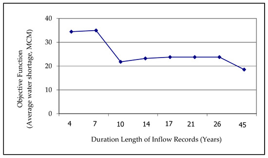 The length of inflow data was investigated in determining the appropriate monthly control curves of Bhumibol and Sirikit Reservoirs by considering the length of runoff data during low water years [48]. They applied a genetic algorithm to a reservoir system simulation model and considered eight separate cases. The cases were: (1) using the year with all historical data (45 years), (2) using the year when the low water event occurred (26 years), (3) using the low water period of 21 years, (4) using the low water period of 17 years, (5) using the low water period of 14 years, (6) using the low water period of 10 years, (7) using the low water period of 7 years, and (8) using the low water period of 4 years.