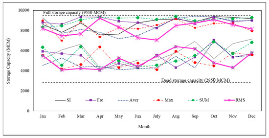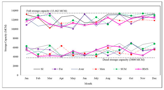 Reservoir operation plays a crucial role in managing water resources, addressing both quantity and quality objectives, which are inherently interconnected [66]. The use of reservoir rule curves is a common approach for effective reservoir management, with the primary goal of minimizing long-term water scarcity. This entails ensuring that the remaining water quantity in the reservoir adheres to the prescribed rule curves for each month. In order to decide the optimal rule curves for both unused and existing stores, it is essential to assess their proficiency in moderating water shortages and excess streams, taking into consideration the frequency, greatness, and length of these occasions [67,68].