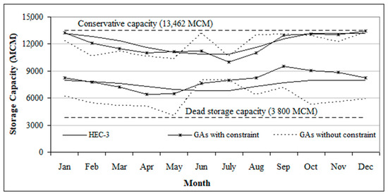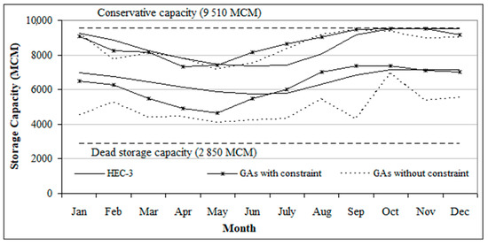 Optimal rule curves of the GAs with constraint and without constraint (the Sirikit Reservoir) [73].