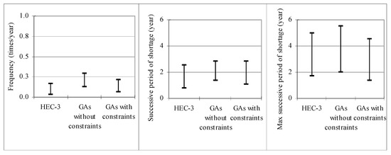 Frequency and successive period of water shortage for HEC-3 simulation approach, the GAs connected simulation algorithm with and without constraints [73].