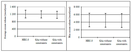 Magnitude of excess release for HEC-3 simulation approach, the GAs connected simulation algorithm with and without constraints [73].